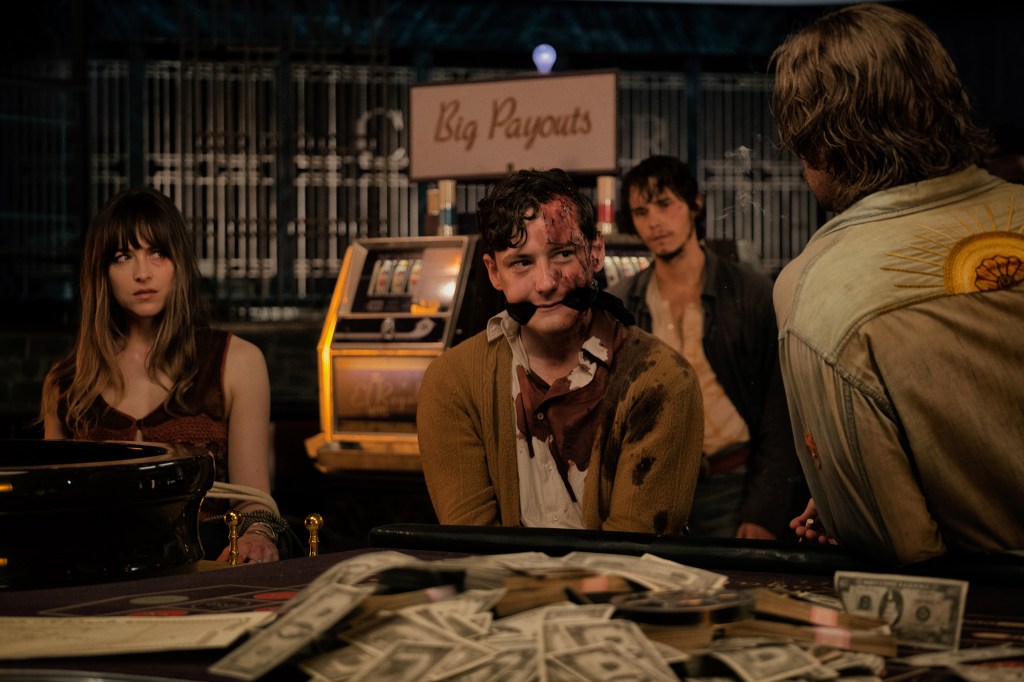 Card #5: Rose (Cailee Spaeny, showing quite a lot of the Priscilla she will soon be famous for) is a face-down card. She’s coming off of an unspecified high– perhaps the high of murdering two people– and is comatose in her room with her sister.